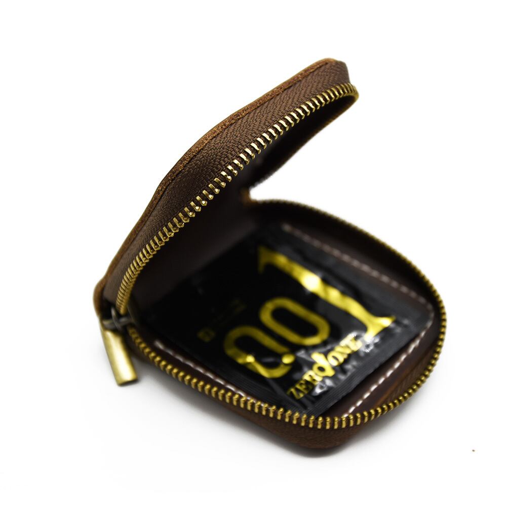 小銭、コインや小物(アクセサリー、USB、イヤホン)の収納用。サイズはD6.5cm×W6.5cm×H2cm。素材はクレイジーホースレザー(牛革)である。